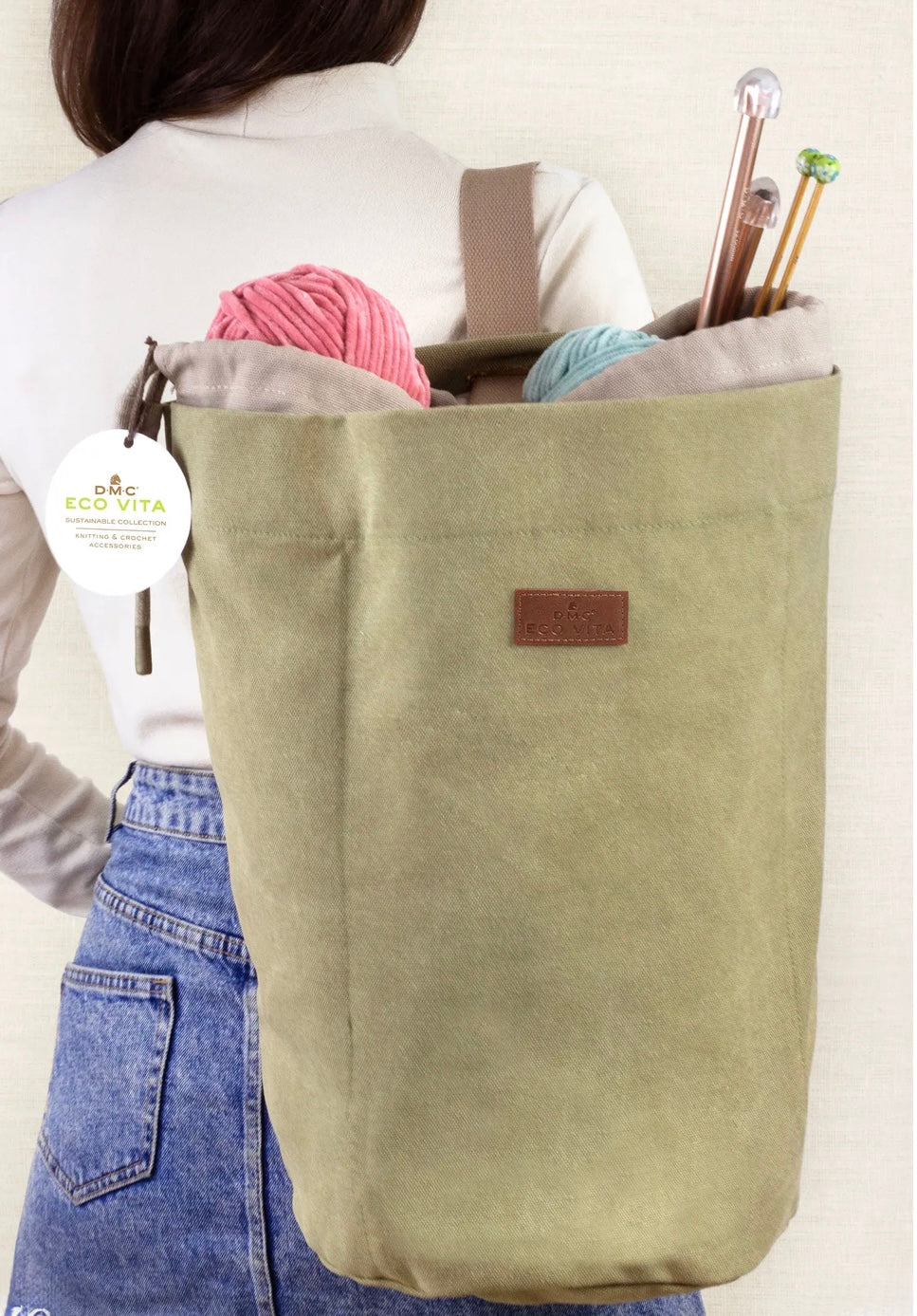 this sailor duffle style bag provides plenty of space for essentials such as yarns, knitting needles, crochet hooks, accessories and more. it features a large main compartment and inside pocket with velcro fastening to ensure valuables and smaller items are safe while on the go. It also has a drawstring top to keep contents secure. a leather label embossed with the DMC Eco Vita logo adds a finishing touch.